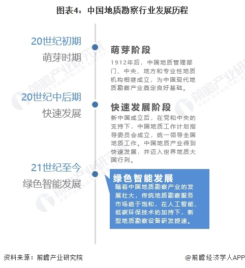 中国地质勘察兴起于20世纪初期,1912年后,中国地质管理部门、中央、地方和专业性地质机构相继成立,为中国现代地质勘察产业奠定良好基础。20世纪中后期,新中国成立后,在党和中央的支持下,中国地质工作计划指导委员会成立,统一领导全国地质工作。中国地质产业得到快速发展,并迈入世界地质大国行列。21世纪至今,随着中国地质勘察产业的发展壮大,传统地质勘察服务市场趋于饱和,在人工智能、低碳环保技术的加持下,新型地质勘察设备研发提速。