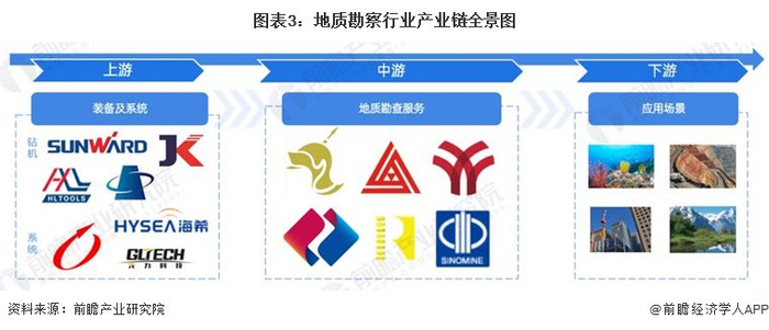 地质勘察行业产业链上游包括钻机装备及勘察系统;中游为地质勘察服务,主要企业包括四川黄金、中矿资源、铜陵有色、中国电建等;下游为地质勘察服务场景,包括区域地质、海洋地质、矿产地质、水文地质、工程地质、环境地质等。