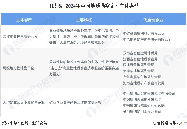 从中国地质勘察企业主体类型来看,国内地质勘察市场现阶段主要有三大类:一是专业勘查技术服务公司,包括中矿资源、中色地科等;二是局级地方性地勘单位;三是大型矿业公司下属勘察企业。