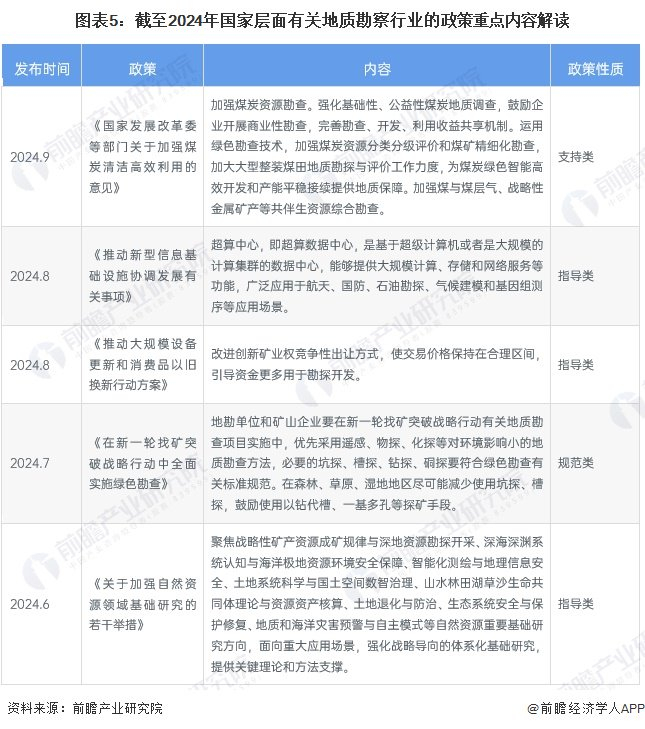 近年来,为更好的引导地质勘察行业的良性发展,政府及有关部门出台了一系列的指导类政策,政策主要围绕加强地质勘察力度、发展绿色勘查、地质勘察智能化发展等方向。