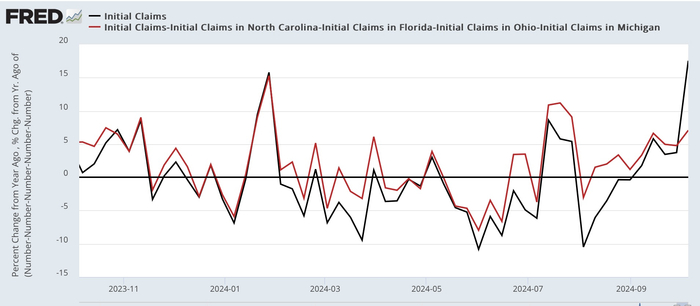 上周,全国初请失业金数据同比上升了17.5%,排除受飓风影响最大的佛罗里达州和北卡罗来纳州,申请人数同比上升了12.5%,再排除可能受罢工行动影响的密歇根州和俄亥俄州,申请人数同比上升了7.1%,与上个月的趋势一致。