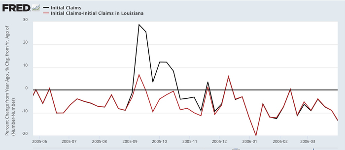 有分析对比了历史上三个排除飓风影响前后的修正初请失业金数据。其中显示,2005年卡特里娜飓风登陆后,包括受飓风影响最大的路易斯安那州在内,申请人数上升了30%,并在之后的五周内保持在较高水平,而同期美国全国其他地区的申请人数同比是下降的。