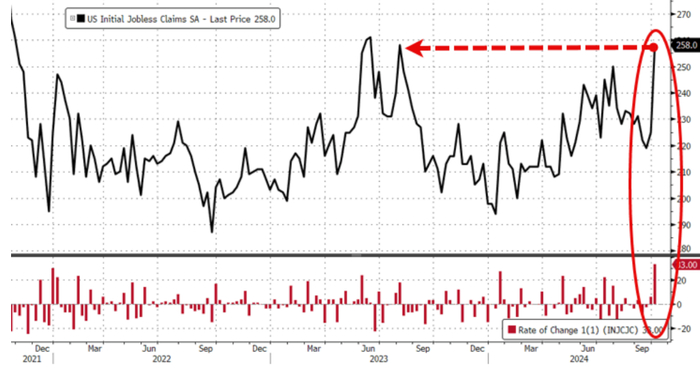 先来看看上周的数据,美国10月5日当周首次申请失业救济人数跃升33000人25.8万人,远高于预期和前值,创下自2023年8月初以来的最高申请人数。