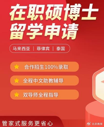 在线上多个平台,记者以“泰国博士”“马来西亚博士”“菲律宾博士”等为关键词进行搜索,很快就弹出不少招生广告。这些广告,大多打着“在职博士”“免费申请”“合作招生100%录取”等宣传噱头。有的机构更是盯紧了目标人群需要提升学历却时间安排不够灵活等现实痛点,宣传“寒暑假博士”“评职称、晋升必选项目”“在职人士的天堂”……为了提升成交率,有机构还表示可“全程服务”“可考公考编,可留服认证(通过教育部留学服务中心国(境)外学历学位认证)”。