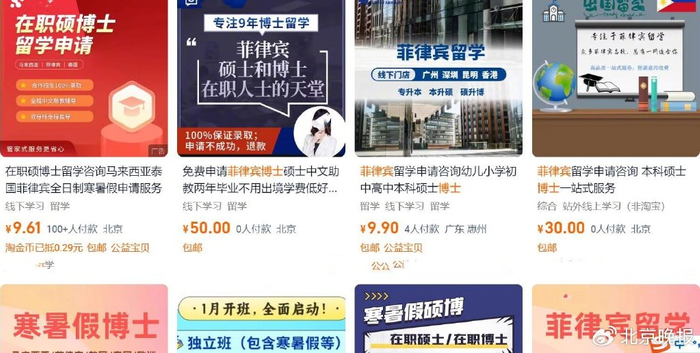 在线上多个平台,记者以“泰国博士”“马来西亚博士”“菲律宾博士”等为关键词进行搜索,很快就弹出不少招生广告。这些广告,大多打着“在职博士”“免费申请”“合作招生100%录取”等宣传噱头。有的机构更是盯紧了目标人群需要提升学历却时间安排不够灵活等现实痛点,宣传“寒暑假博士”“评职称、晋升必选项目”“在职人士的天堂”……为了提升成交率,有机构还表示可“全程服务”“可考公考编,可留服认证(通过教育部留学服务中心国(境)外学历学位认证)”。
