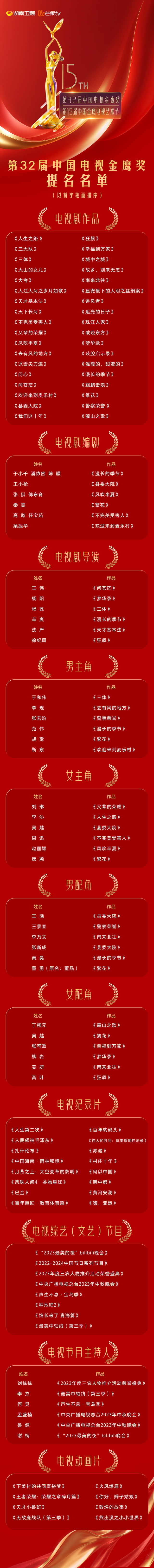 据介绍,第32届中国电视金鹰奖评选自今年5月正式启动,全国各地区电视机构和网络视听平台推荐电视剧、电视纪录片、电视综艺(文艺)节目、电视动画片四个类别共计630部作品,参加电视作品奖和创作单项奖的角逐。