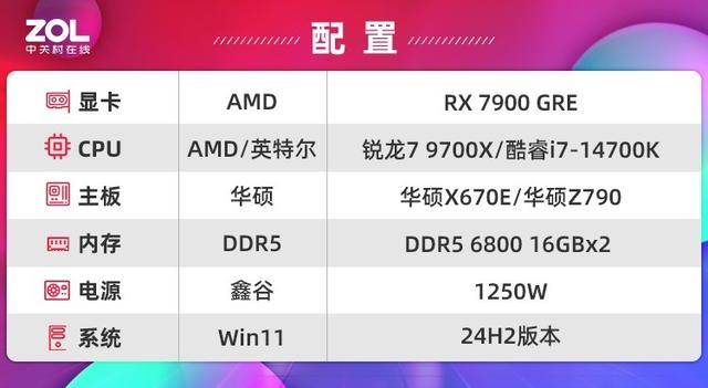 单从参数而言,AMD锐龙7 9700X似乎没有占据多少优势,不过网游不像单机,过多的核心并不能带来有效的帧数提升,通常吃到8个核心就是极限了,同时除了这些明面上的参数,处理器的架构也很重要,架构与工艺同步升级才能让处理器迭代时带来性能飞跃,而这次在先进的4nm制程工艺下,AMD还采用了全新的ZEN5架构,让IPC有超过15%的巨大提升,所以即使一些参数落后,具体和酷睿i7-14700K在网游上的表现也值得期待,下面咱们直接开始测试,测试平台如下: