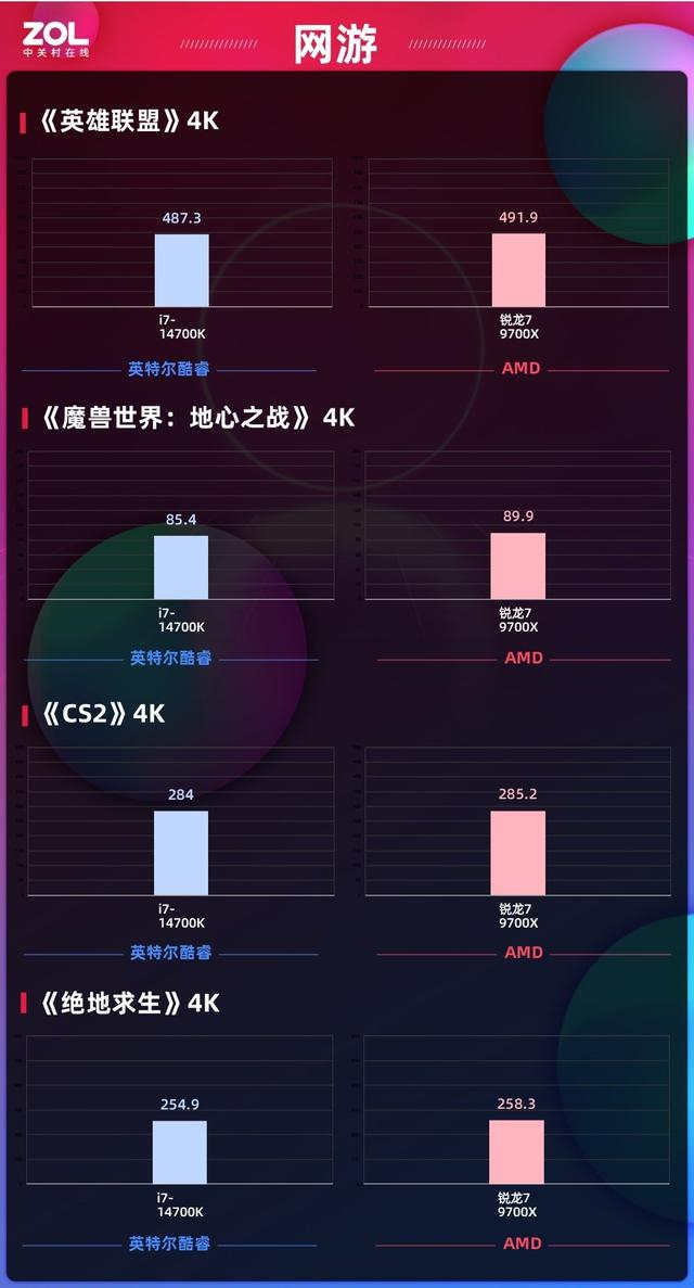 在1080p分辨率中,AMD锐龙79700X对比酷睿i7-14700K在《绝地求生》、《英雄联盟》以及《魔兽世界:地心之战》三款游戏中帧数都有更好的表现,《CS2》则是酷睿i7-14700K更强一些。