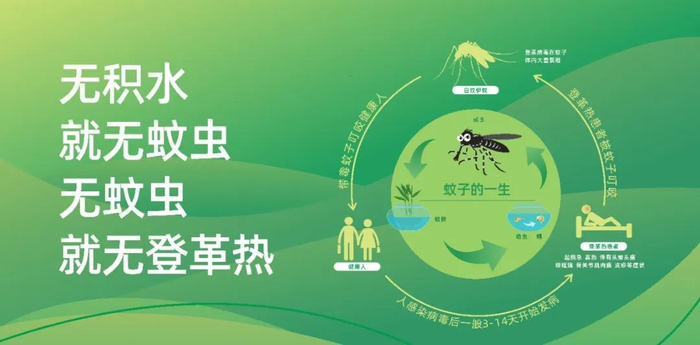预防登革热从控制伊蚊着手,无积水就无幼虫,无幼虫就无成蚊,无成蚊就无登革热传播。
