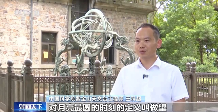 中国科学院紫金山天文台工程师 王科超:我们天文学当中对月亮最圆的时刻的定义叫作“望”。所谓的“望”是指月亮和太阳的地心视黄经相差180度,这时月亮、地球和太阳近乎一条直线的排列,这时我们看到的月亮最圆。