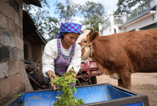 (小英切了一些野菜与饲料拌在一起喂牛)