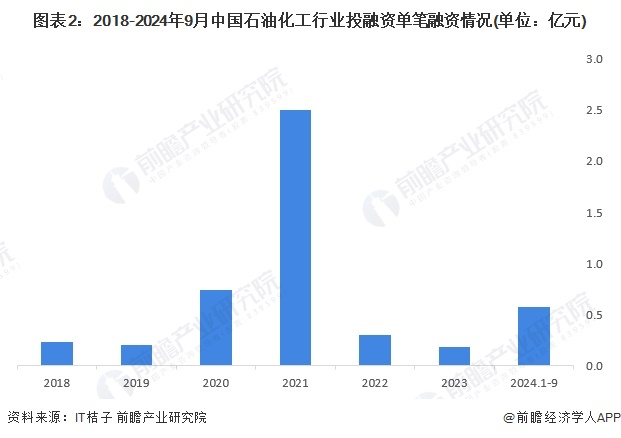 从单笔融资金额来看,2018-2023年单笔融资金额先升后降,2021年达到近年来顶峰,单笔融资金额达到2.5亿元。截至2024年9月11日,石油化工行业单笔融资金额约0.6亿元。