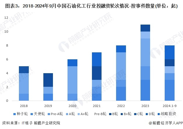 从石油化工的投资轮次分析,目前石油化工行业的融资轮次仍然处于早期阶段,投融资集中在A轮及以前。