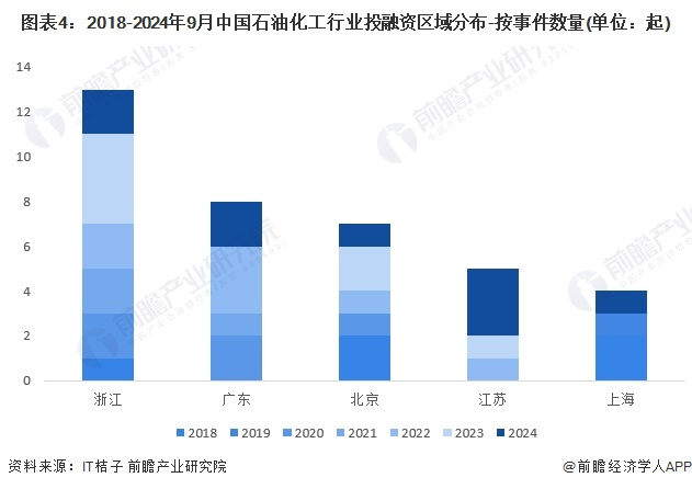 3、石油化工行业投融资集中在浙江、广东和北京