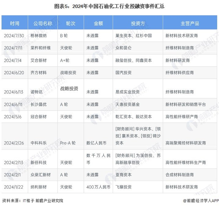 从2024年中国石油化工行业投融资事件来看,目前我国石油化工行业投融资主要集中在合成材料,尤其是合成纤维领域,2024年我国石油化工行业的主要投融资事件如下: