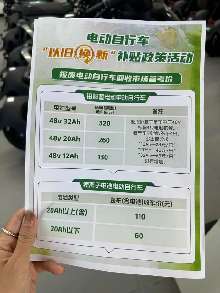 按照以旧换新补贴政策,交投旧车也有残值价款。如旧车是铅酸蓄电池车型的,48v、32Ah的回收价320元,48v、20Ah的回收价260元,48v、12Ah的回收价130元;如旧车是锂电池车型的,20Ah以下60元,20Ah及以上110元。消费者先获得残值价款,再在购买新车时享受立减补贴500元。可以使用云闪付、微信、支付宝。