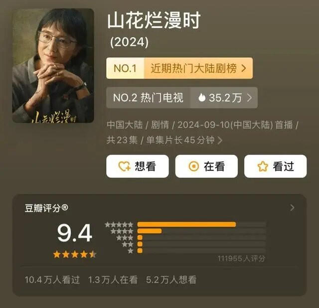 今年教师节,根据张桂梅真实事迹改编的电视剧《山花烂漫时》播出。剧播完大半个月了,口碑还在攀升,截至目前,10万人打出9.4分,拿下今年国产剧最高分。