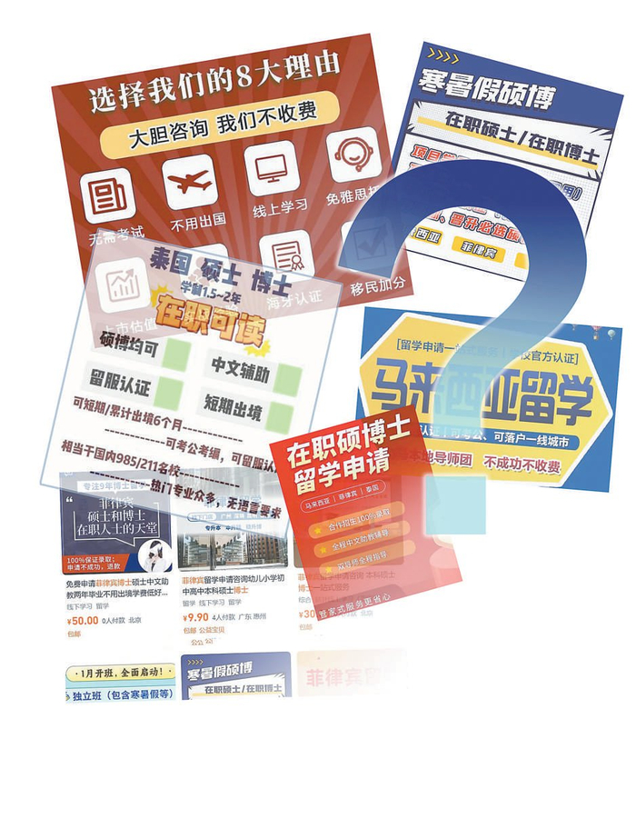 在线上多个平台,记者以“泰国博士”“马来西亚博士”“菲律宾博士”等为关键词进行搜索,很快就弹出不少招生广告。这些广告,大多打着“在职博士”“免费申请”“合作招生100%录取”等宣传噱头。有的机构更是盯紧了目标人群需要提升学历却时间安排不够灵活等现实痛点,宣传“寒暑假博士”“评职称、晋升必选项目”“在职人士的天堂”……为了提升成交率,有机构还表示可“全程服务”“可考公考编,可留服认证,通过教育部留学服务中心国(境)外学历学位认证”。