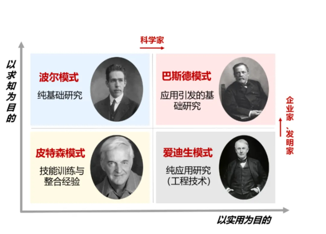 我们可以看这个直角坐标系,横轴表示研究的动机,好奇心驱动型还是应用驱动型,纵轴表示知识的性质,是否具有基础性和原理性,那么所产生的四个象限就形成了“玻尔象限”(代表好奇心驱动型纯基础研究),“爱迪生象限”(代表为了实践目的应用研究),此外会出现一种新的类型——“巴斯德象限”(代表由解决应用问题产生的基础研究),之所以命名为巴斯德象限,是因为巴斯德在生物学上许多前沿性基础工作的动力是为了解决治病救人的实际难题。另外,还有只是为了获取技巧和经验的“皮特森象限”。当然每一个象限不是相互隔绝的,而是存在着复杂的双向乃至多向的联系。
