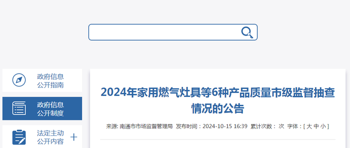江苏省南通市发布2024年家用燃气灶具等6种产品质量市级监督抽查情况