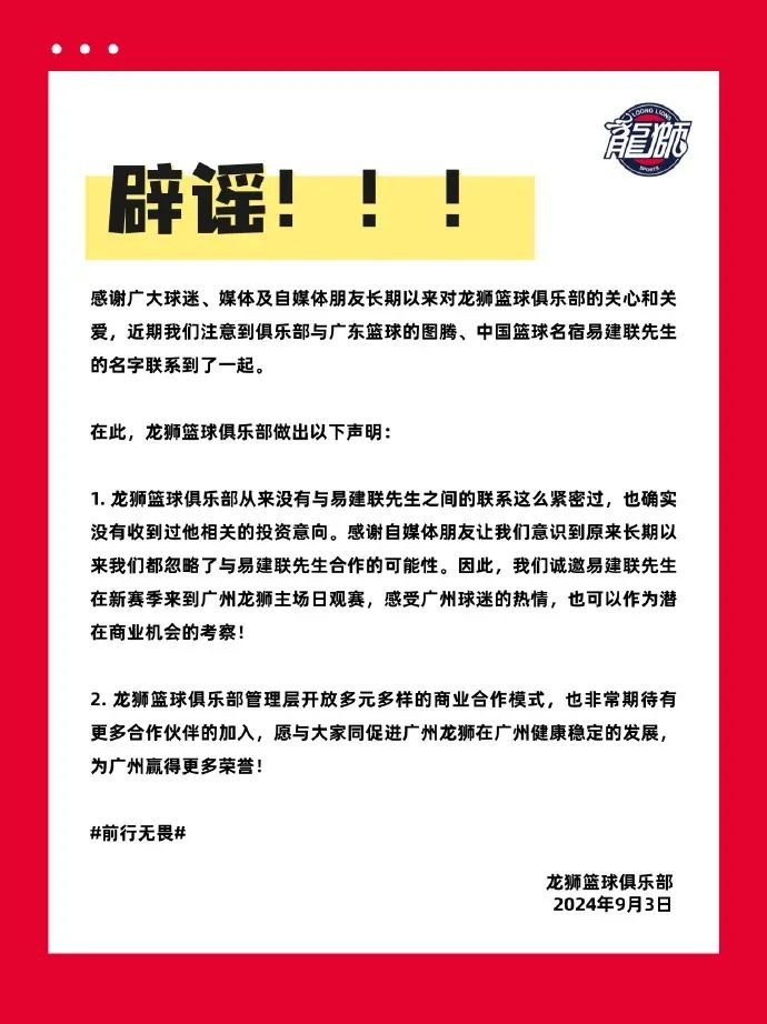 不过在9月3日,广州龙狮篮球俱乐部迅速做出回应,公开辟谣。公告中明确表示,俱乐部与易建联从未有过紧密联系,也未收到其投资意向。