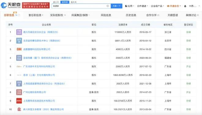 天眼查App显示,易建联共关联16家企业,其中13家为存续状态,包括嘉兴丹青投资合伙企业(有限合伙)、薪火阵营文体教育(深圳)集团有限公司、上海壹球成名信息技术有限公司、成都趣睡科技股份有限公司等,商业履历信息显示,易建联在16家企业持股、在5家企业任职,版图除体育文化外,还涉及商贸、科技、投资等领域。