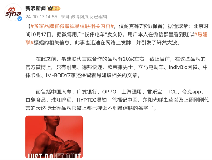 据懂球帝报道,在此之前,易建联代言或合作的品牌有20家左右。截止目前,在这些品牌的官方微博上,耐克、德邦快递、欧莱雅男士、立马电动车、IndivBio因微、中体卡业、IM-BODY7家还保留着易建联相关的文章。