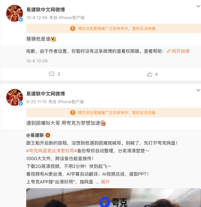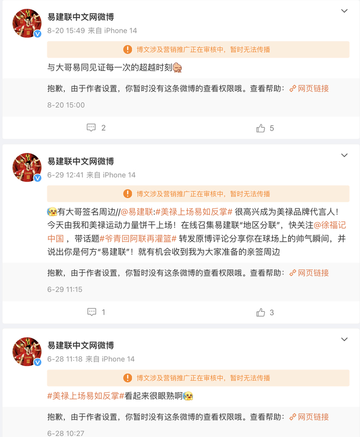 记者查询发现,在@易建联中文网官微,多条微博显示“博文涉及营销推广正在审核中,暂时无法传播”,还有部分官微将商务广告设为隐私状态。