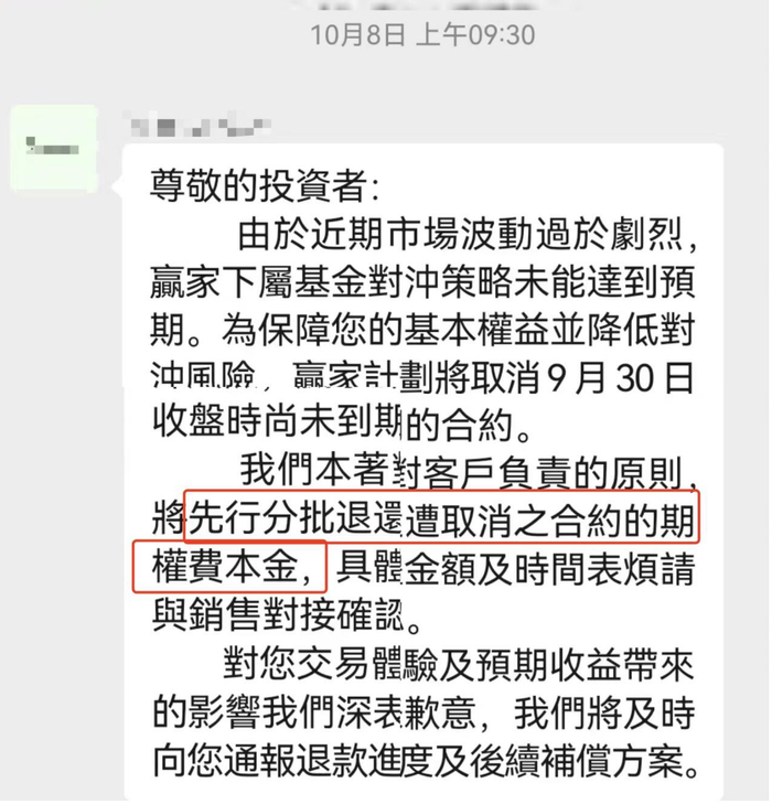 赢家证券业也表示,将分批退还遭到取消合约的期权费本金。