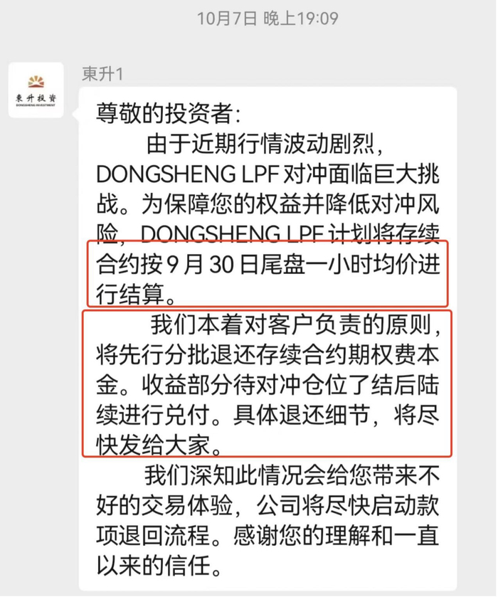 东升一直与投资者沟通较为频繁,自10月7日以来,东升与投资者持续在沟通,表示将分批退还,到了10月10日,东升拿出了具体的方案,在第一期按照期权本金的20%左右比例进行退款,退款时间在本周五(10月18日)或者下周一(10月21日)陆续收到退款款项。此外,东升还表示,退款完后,并将在下周二(10月22日)安排线上会议,与投资者详细沟通后续还款计划。公司最后表示将“承担起应有的责任,不会逃避。”