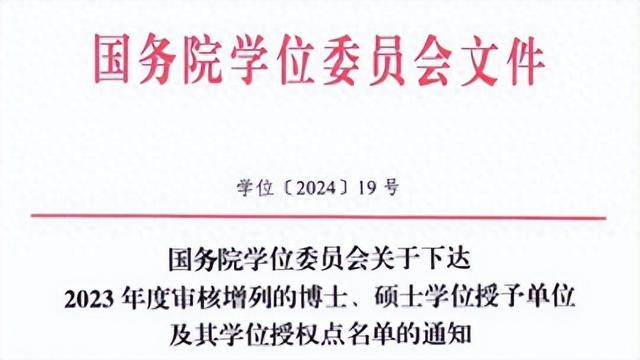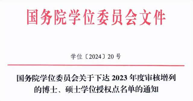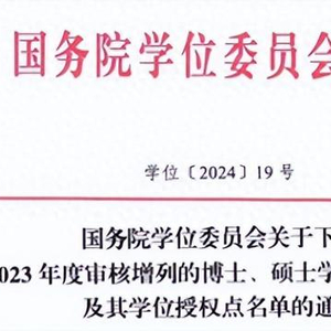 近日,国务院学位委员会发布关于下达2023年度审核增列的博士、硕士学位授予单位及其学位授权点名单的通知(学位[2024]19号)和关于下达2023年度审核增列的博士、硕士学位授权点名单的通知(学位[2024]20号)。