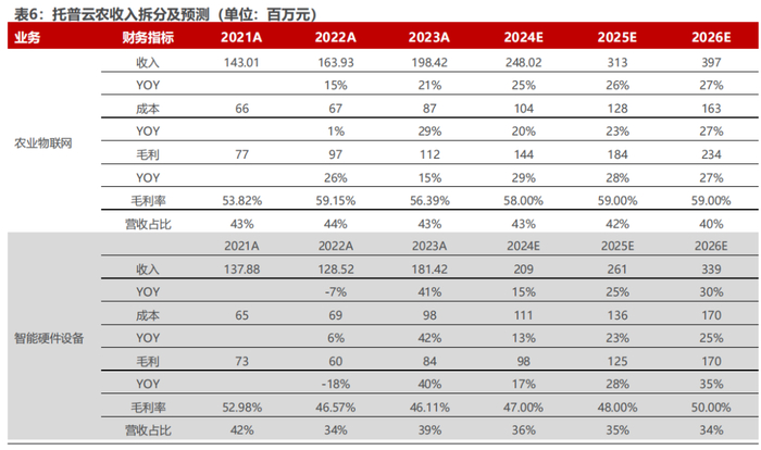 1)农业物联网业务:在我国农业现代化转型需求、国家政策支持的背景下,以农业主管部门为主导的下游客户在耕地保护、植物保护、环境监测、智能设施等单一或综合领域的智能化、信息化和数字化产品的需求和投入增加,农业物联网项目相关投资有望加大进而带动公司业务增长,我们预计2024-2026年公司农业物联网业务增速分别为25%/26%/27%;毛利率方面,考虑到未来业务模式和商业模式都相对稳定,扩大产能增强规模优势,我们预计该业务2024-2026年毛利率有望稳中向好,预计分别为58%/59%/59%;