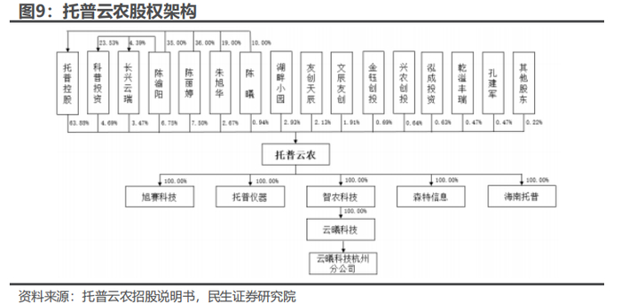 公司创始人、董事长陈渝阳夫妇持股占比较高,核心团队技术背景浓厚。陈渝阳夫妇直接持股14.25%,此外重大持股情况还有持有托普云农母公司托普控股71%股权,托普控股持股托普云农63.88%。核心团队方面,陈渝阳毕业于浙江大学农学院,长期从事智能装备、智慧应用、农业农村数字化的研究,主持完成多项国家、省市级重大项目并解决一系列关键技术;吴家满,毕业于浙江大学计算机学院,具有前后 15 年“三农”信息化经验,精通将大数据、人工智能、遥感等信息化技术与“三农”行业业务深度融合,参与了浙江省数字乡村实施方案等规划方案编写;谢朝明,毕业于宁波大学计算机及应用专业,具有 10 余年从事通信、网络系统以及计算机软件研究和开发的实践经验。