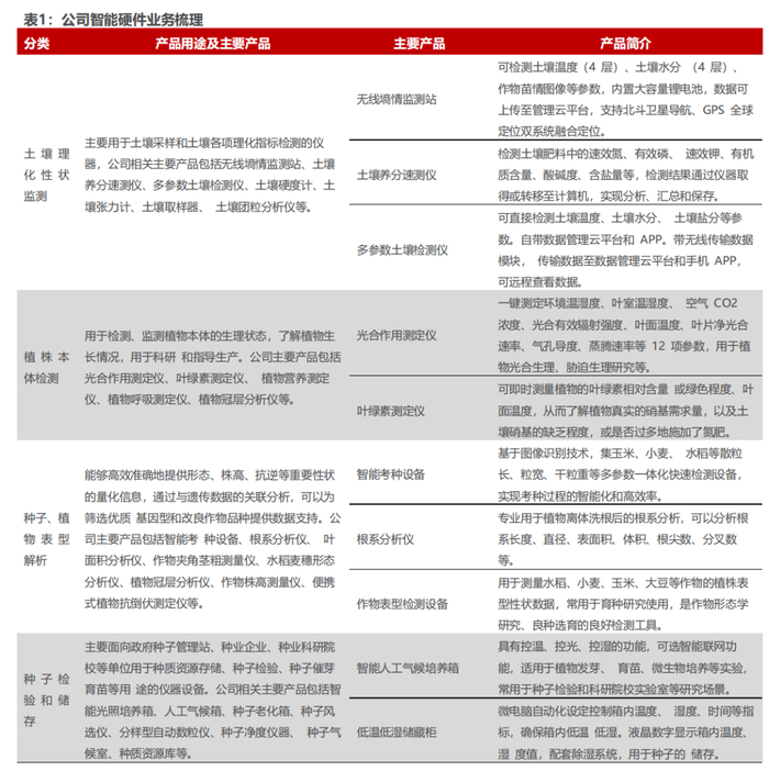 1) 智能设备导向阶段(2008-2012年):公司成立初期以农业精密仪器的研发生产为主,收入的主要来源是智能硬件设备的销售。通过多年在种子科研、土壤监测、植物生理等细分领域的技术研发与销售拓展,公司产品取得了市场较高的认可,在相关硬件及嵌入式软件方面建立了坚实的技术基础和业务基础,主要里程碑包括农林环境监测系统、面积测量仪等产品获得了国家级星火计划项目证书等;