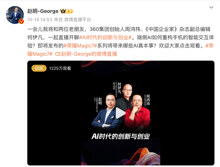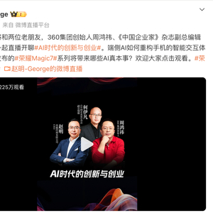 如上图所见,10月14日荣耀终端有限公司CEO赵明与360集团创始人、董事长周鸿祎举行了一场直播活动,除了预热Magic7系列要打造最强AI手机外,还接受主持人提问回答了一个外界关心的问题。