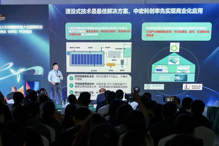 昨日(16日),在2024北京国际风能大会中,中宏科创携手bp嘉实多联合发布分布式浸没储能产品,该产品也是国内首个成功通过新国标认证的浸没式锂电产品。