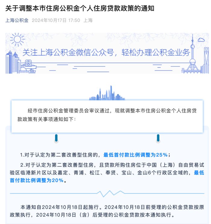 上海市公积金管理中心10月17日发布《关于调整本市住房公积金个人住房贷款政策的通知》(以下简称《通知》)称,对于认定为第二套改善型住房的,最低首付款比例调整为25%;对于认定为第二套改善型住房,且贷款所购住房位于中国(上海)自由贸易试验区临港新片区以及嘉定、青浦、松江、奉贤、宝山、金山6个行政区全域的,最低首付款比例调整为20%。《通知》自2024年10月18日起施行。