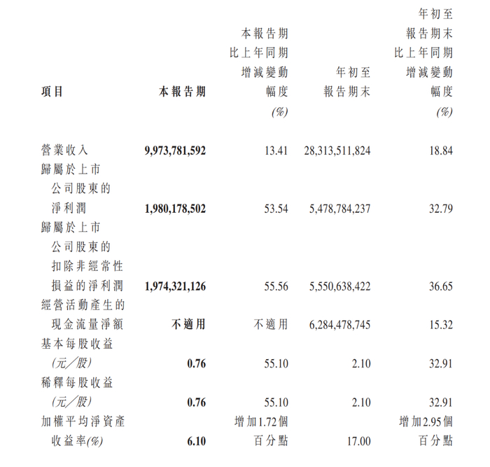 该季度净利润19.8亿元,同比增长53.54%,仅次于今年二季度21.11亿元的单季历史最高利润水平。