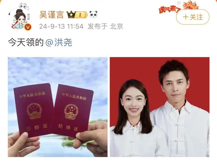 据此前报道,9月13日,演员吴谨言、洪尧发微博晒出结婚证,配文:“今天领的”,“今天结的”,并艾特彼此,甜蜜官宣结婚的好消息。据悉,二人曾合作《延禧攻略》《皓镧传》。