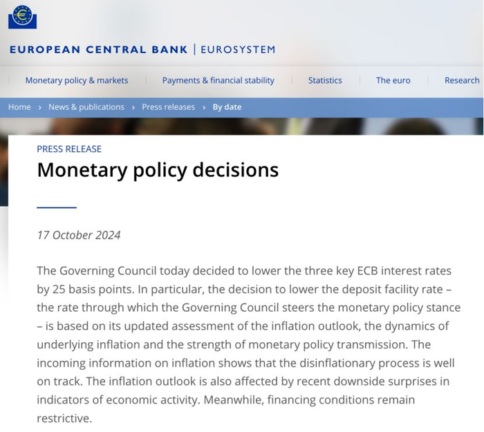 北京时间10月17日晚间,欧洲央行宣布,将三大利率均下调25个基点,将主要再融资利率、边际借贷利率和存款机制利率分别下调至3.4%、3.65%和3.25%,符合市场预期。这是今年内欧洲央行的第三次降息。