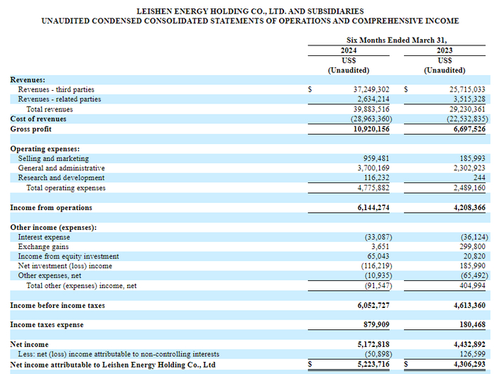 招股书显示,在过去的2022财年、2023财年(财政年度截止日期为9月30日)和2024财年前六个月(截至2024年3月31日),雷神能源的收入分别为4,671.65万、7,308.44万和 3,988.35万美元,相应的净利润分别为572.21万、1,185.86万和 522.37万美元。