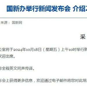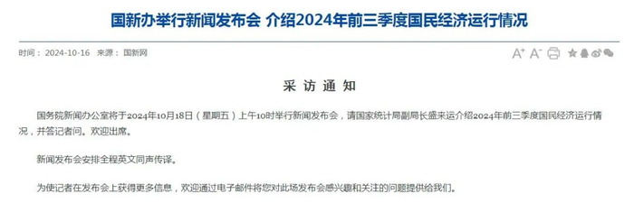 10月18日(星期五)上午10时,国新办将举行新闻发布会,国家统计局副局长盛来运将在此次发布会上介绍2024年前三季度国民经济运行情况。