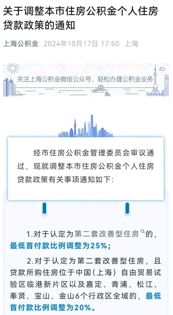 “上海公积金”公众号10月17日发布《关于调整本市住房公积金个人住房贷款政策的通知》,进一步优化调整上海市住房公积金个人住房贷款政策。