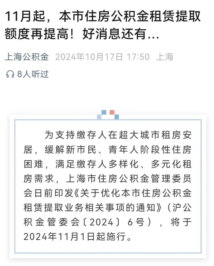 同日,“上海公积金”公众号消息,上海市住房公积金管理委员会日前印发《关于优化本市住房公积金租赁提取业务相关事项的通知》,对租房提取限额与提取频率进行了优化。自11月1日起施行,有效期为5年。