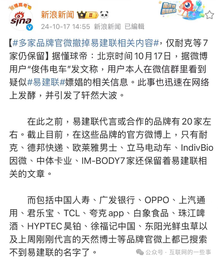 多家与易建联有合作关系的品牌做出反应,删除了与其相关的宣传内容。
