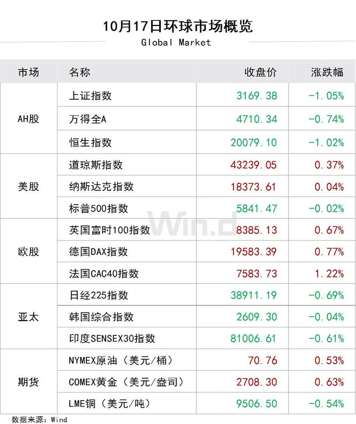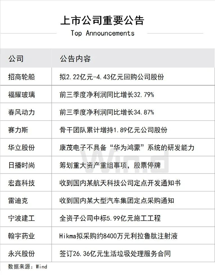 5、Wind数据显示,截至10月17日21时,共有63家上市公司披露三季报,其中43家公司实现净利润同比增长。随着上市公司三季报陆续披露,机构预计三季报业绩好于预期的公司及行业将成为市场阶段主线。