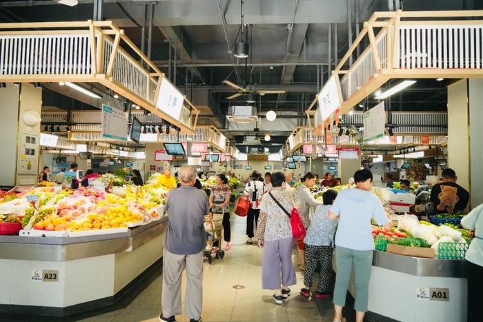 改造后,菜场增设海鲜、牛羊肉、水果等业态,摊位数量由60个增加至71个,基本保障类业态由14项增加至23项,品质提升类业态由3项增加至10项,智慧升级类业态由1项增加至4项,菜场功能更加丰富,从单一生鲜食品售卖的场所转型为综合性的商业空间。