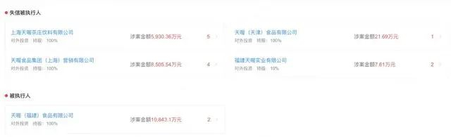 据企查查数据,天喔食品(集团)有限公司成立于1999-12-02,法定代表人为黄秋洋,注册资本为99000万港元。据风险信息显示,该公司存在多条被执行人信息。