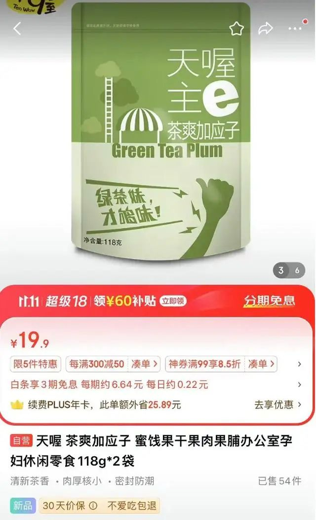10月16日广东潮州,市民萧女士发视频称,她在天喔官方旗舰店买了一些蜜饯,收货后准备吃时,看到茶爽加应子的包装广告语为“绿茶妹才够味”,此广告语有辱女的嫌疑,她对此表示很恶心,后续她也联系了官方客服进行投诉。