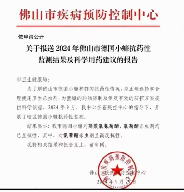 近日,一份盖着“佛山市疾病预防控制中心”(下称“佛山疾控中心”)公章的报告截图在不少微信群里疯传。截图内容显示,佛山市德国小蠊种群对高效氯氰菊酯、氯菊酯杀虫剂均已呈抗性,其中,对氯菊酯杀虫剂呈高度抗性。